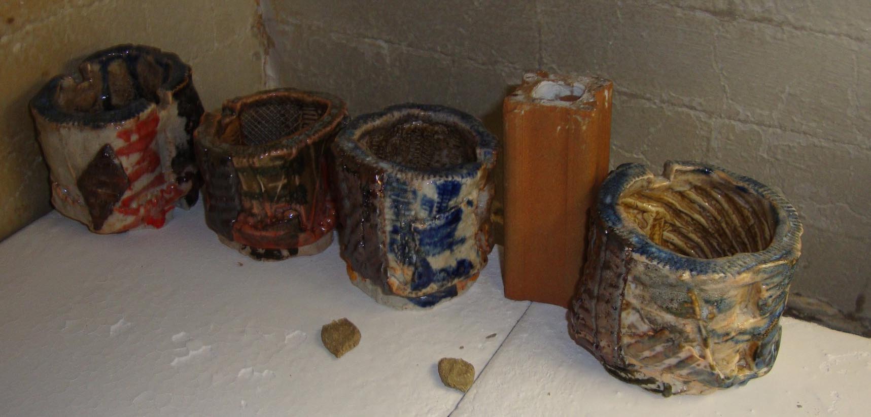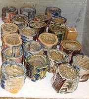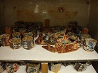 Tea Bowls are a common piece of the ceramic artist's repertoire. With the influence of Bernard Leach, tea bowls became a mark of a Japanese influence. Tom is intrigued by the varied textures and glazes that can be combined to make thousands of unique tea bowls. Below are pictures of some of the most recent teabowls. The images below show both unfired and fired tea bowls. Notice that some whole shelves are teabowls. Each of these images displays a gradient in the tea bowl series.