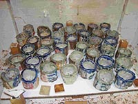 Tea Bowls are a common piece of the ceramic artist's repertoire. With the influence of Bernard Leach, tea bowls became a mark of a Japanese influence. Tom is intrigued by the varied textures and glazes that can be combined to make thousands of unique tea bowls. Below are pictures of some of the most recent teabowls. The images below show both unfired and fired tea bowls. Notice that some whole shelves are teabowls. Each of these images displays a gradient in the tea bowl series.